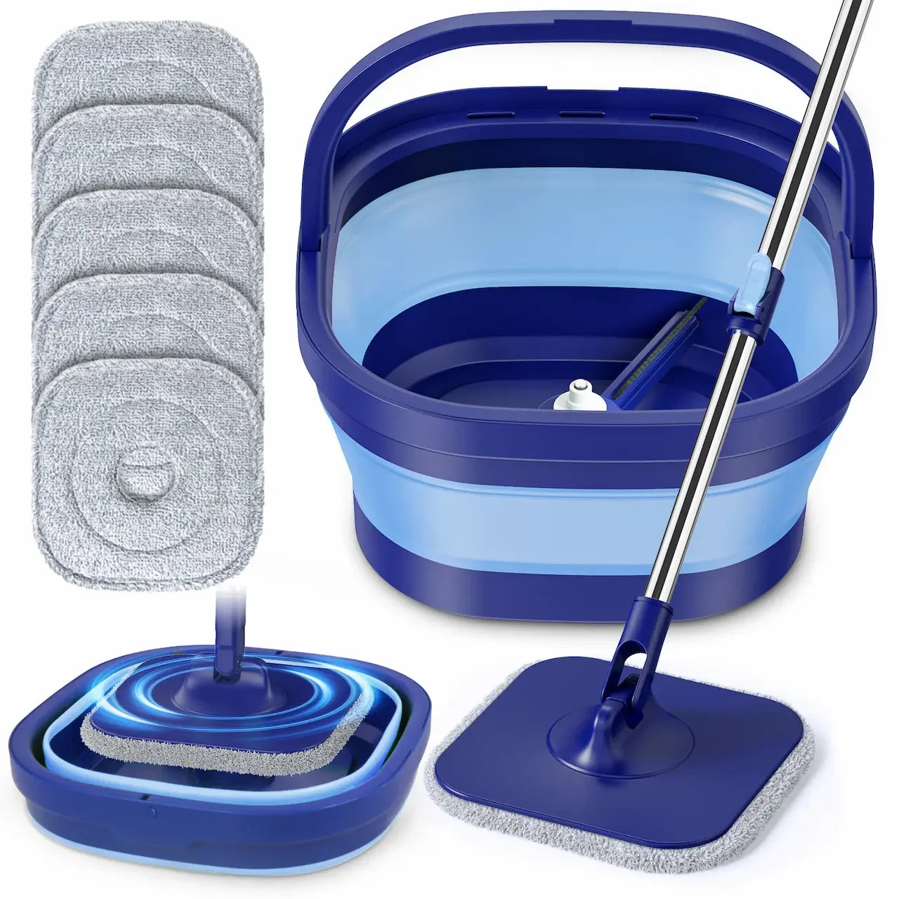 Spin Mop and Bucket Set: Household Wet Dry Mop for Cleaning Floors - Collapsible Bucket for Small Home - 5 Reusable Microfibre Replacement Pads Blue